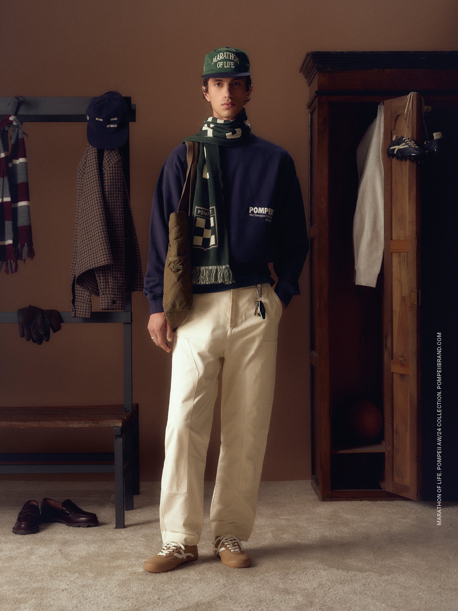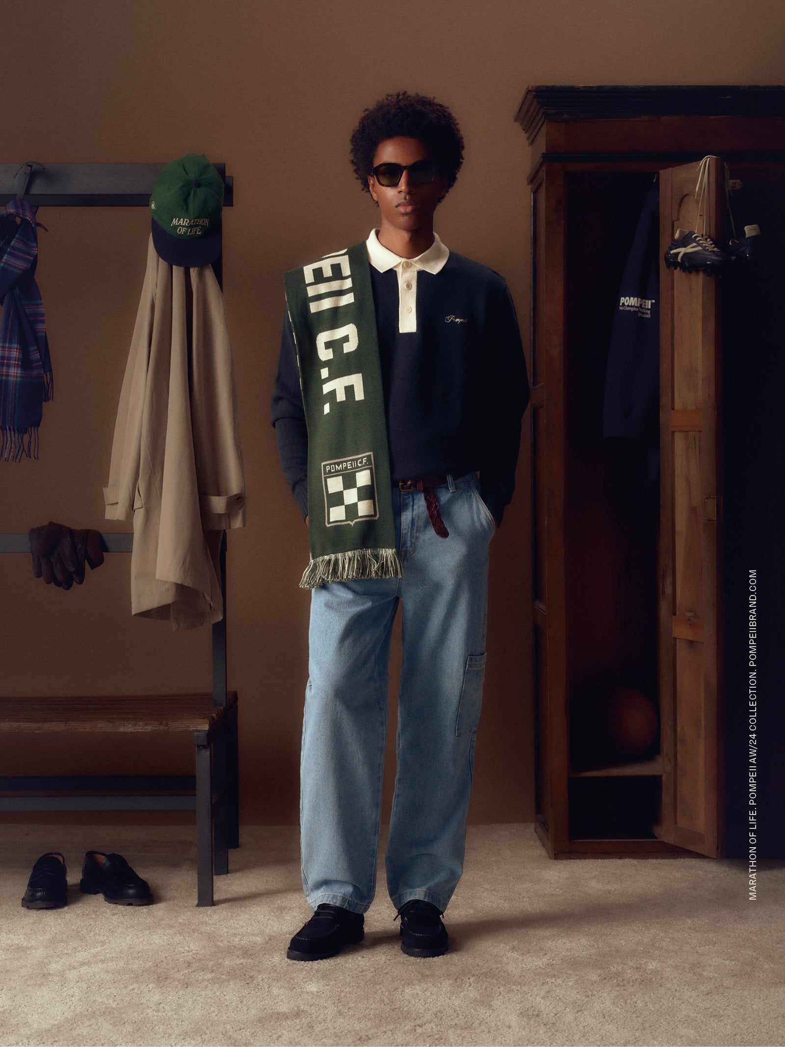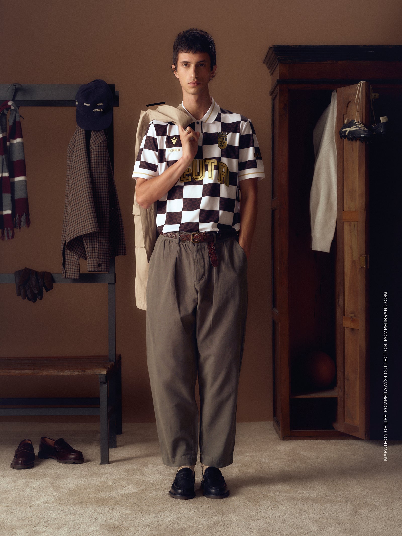 The lookbook, inspired by the spirit of sport, adopts a timeless visual narrative that underscores Pompeii’s deep connection to football—an essential part of its DNA. The garments are showcased in athletic settings, emphasizing the synergy between fashion and performance. From the iconic football jersey, crafted in collaboration with AD Ceuta FC, to classic silhouettes in rich, seasonal hues, the collection captures a style that is both sophisticated and functional.