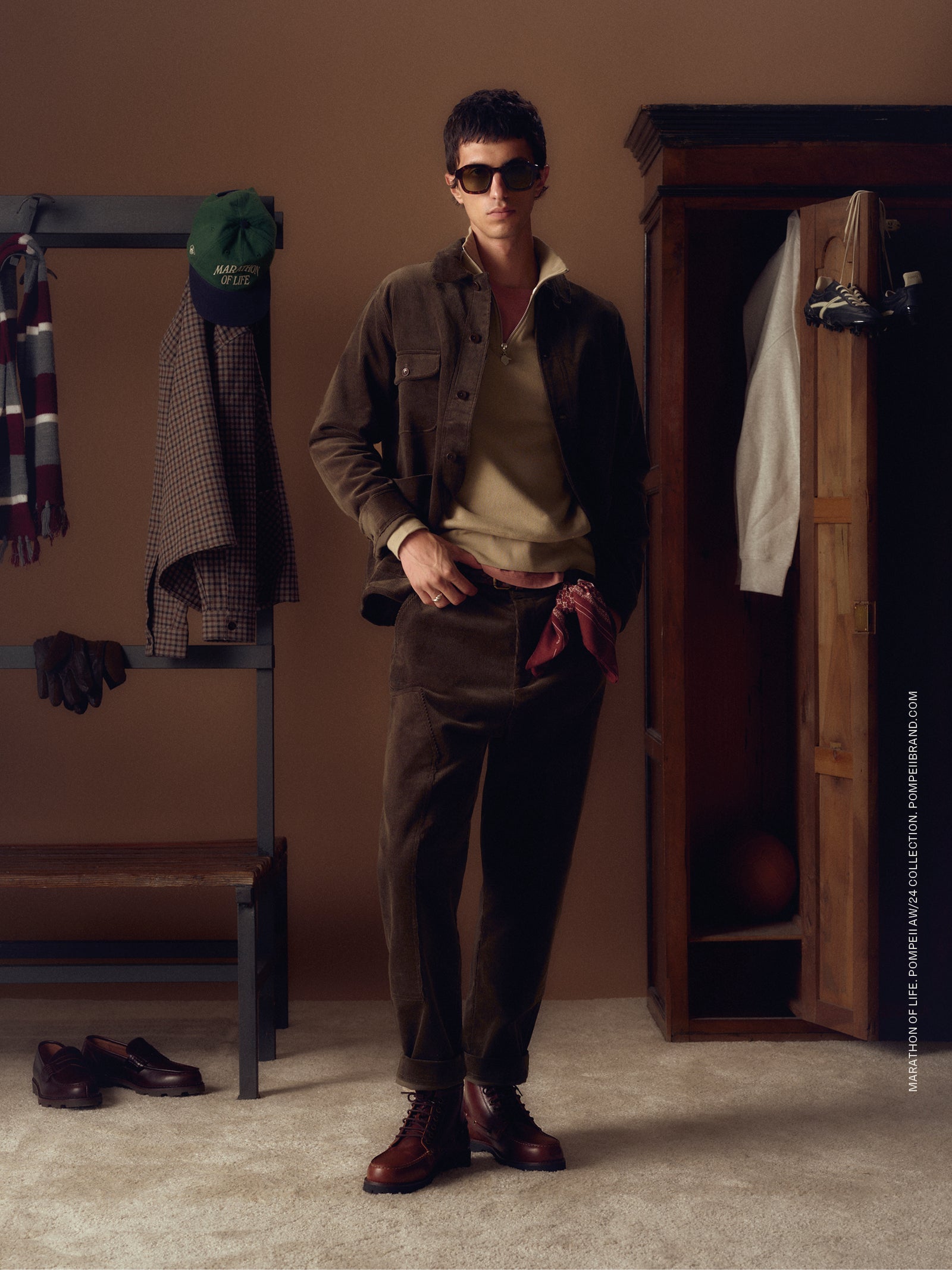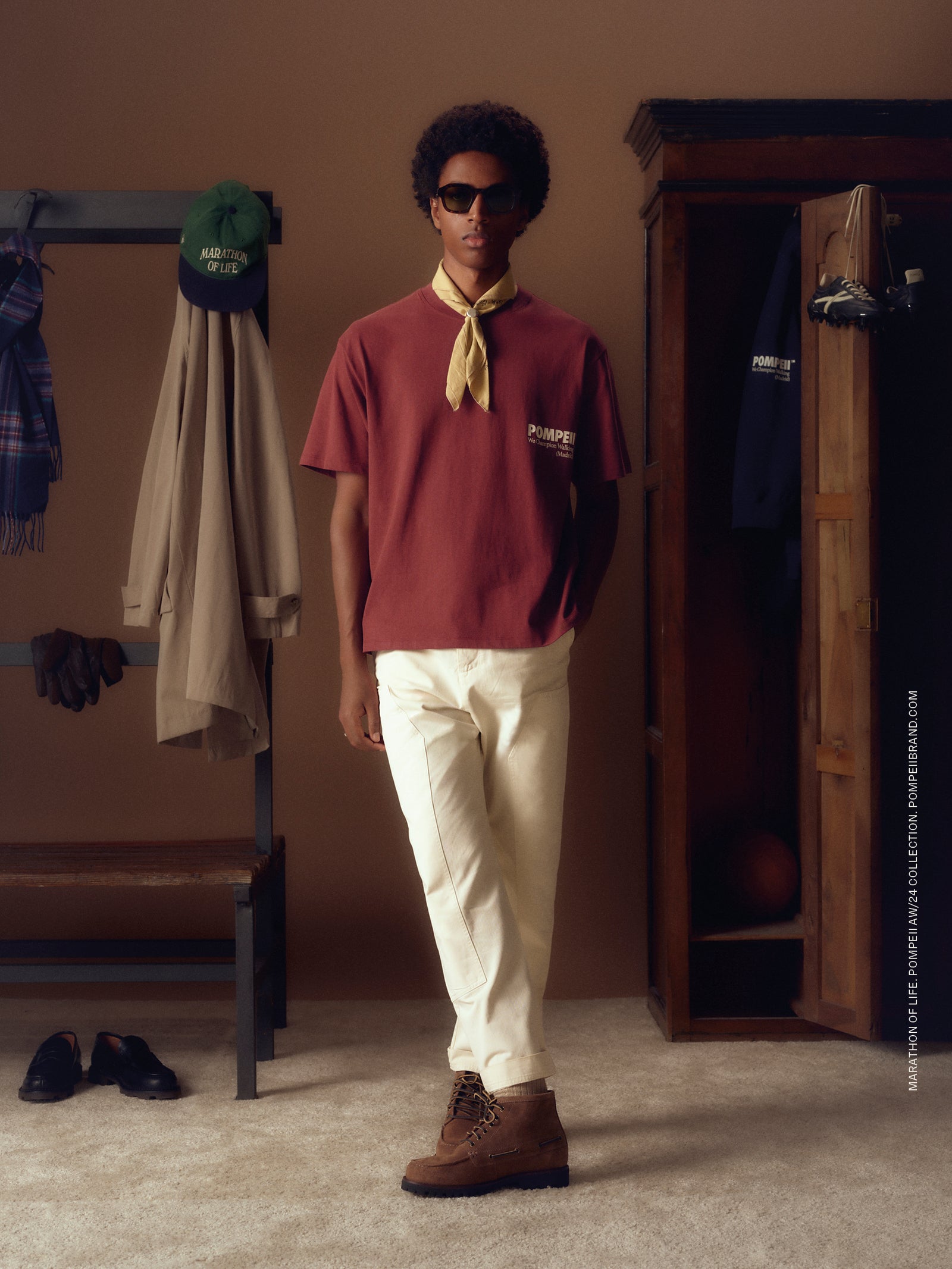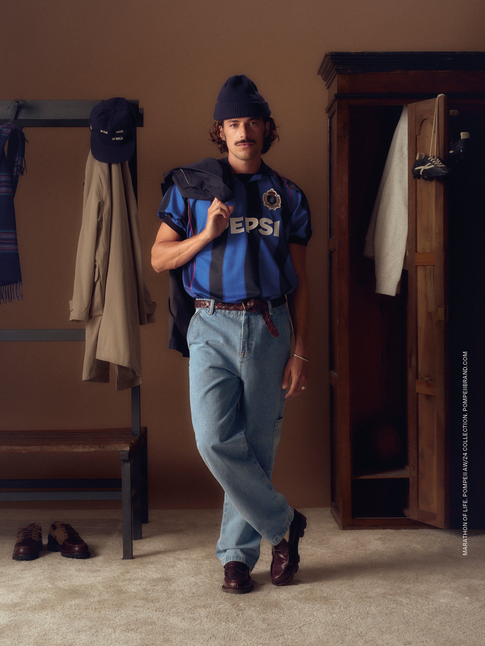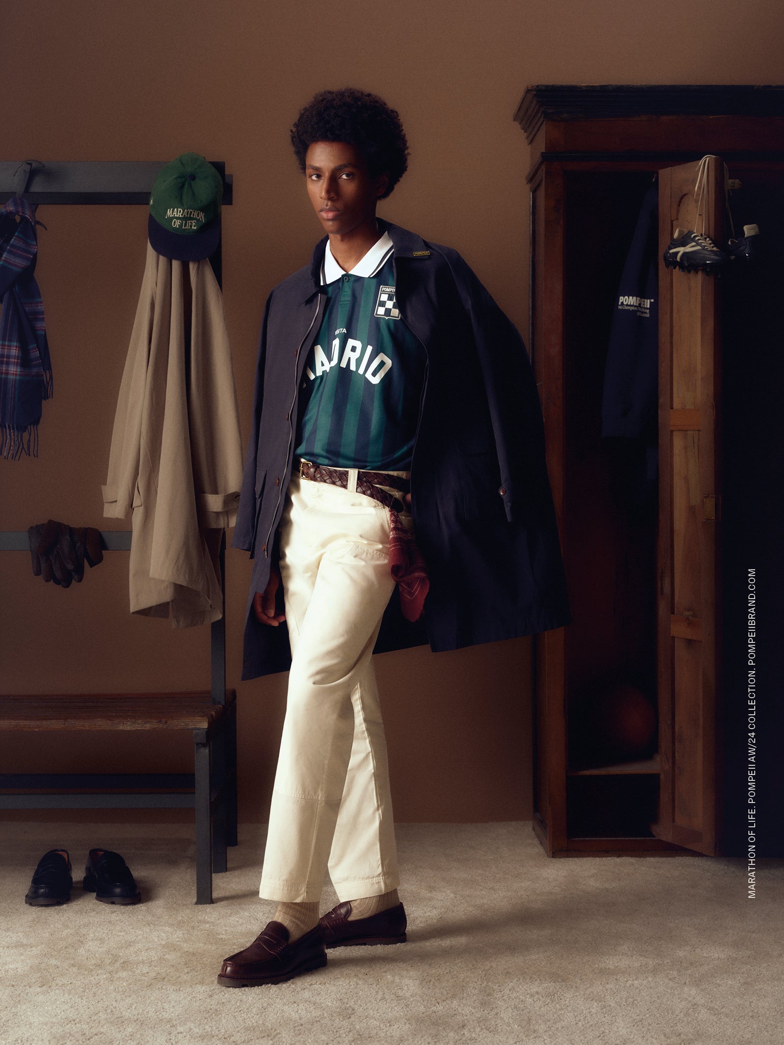 The lookbook, inspired by the spirit of sport, adopts a timeless visual narrative that underscores Pompeii’s deep connection to football—an essential part of its DNA. The garments are showcased in athletic settings, emphasizing the synergy between fashion and performance. From the iconic football jersey, crafted in collaboration with AD Ceuta FC, to classic silhouettes in rich, seasonal hues, the collection captures a style that is both sophisticated and functional.
