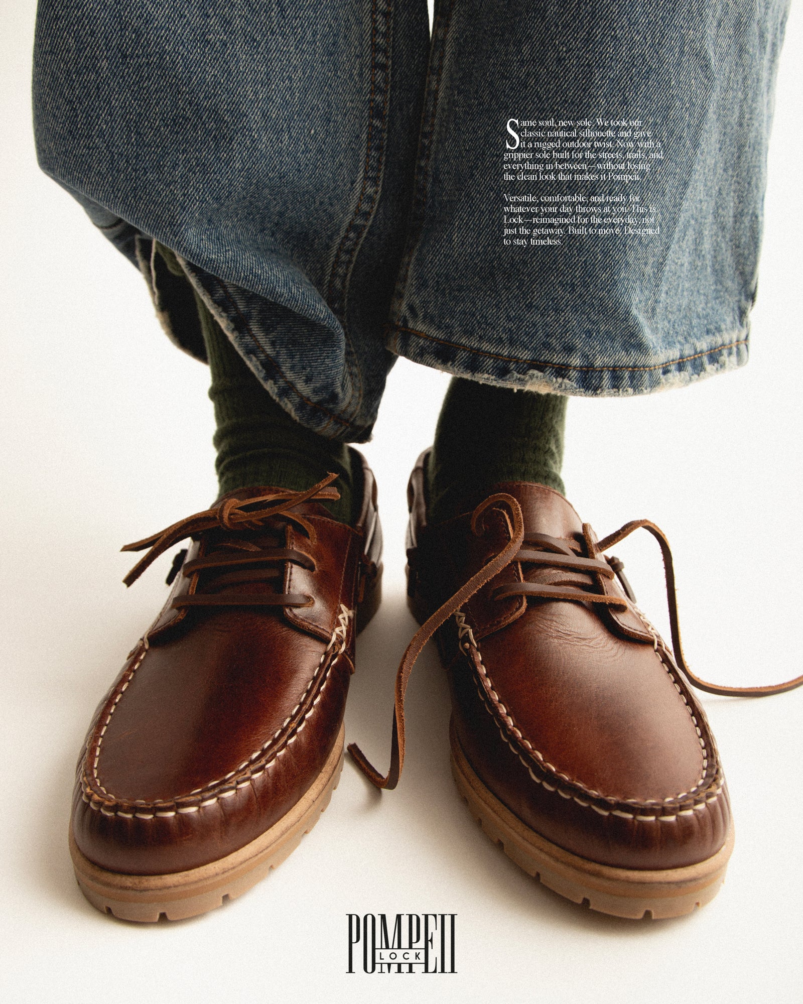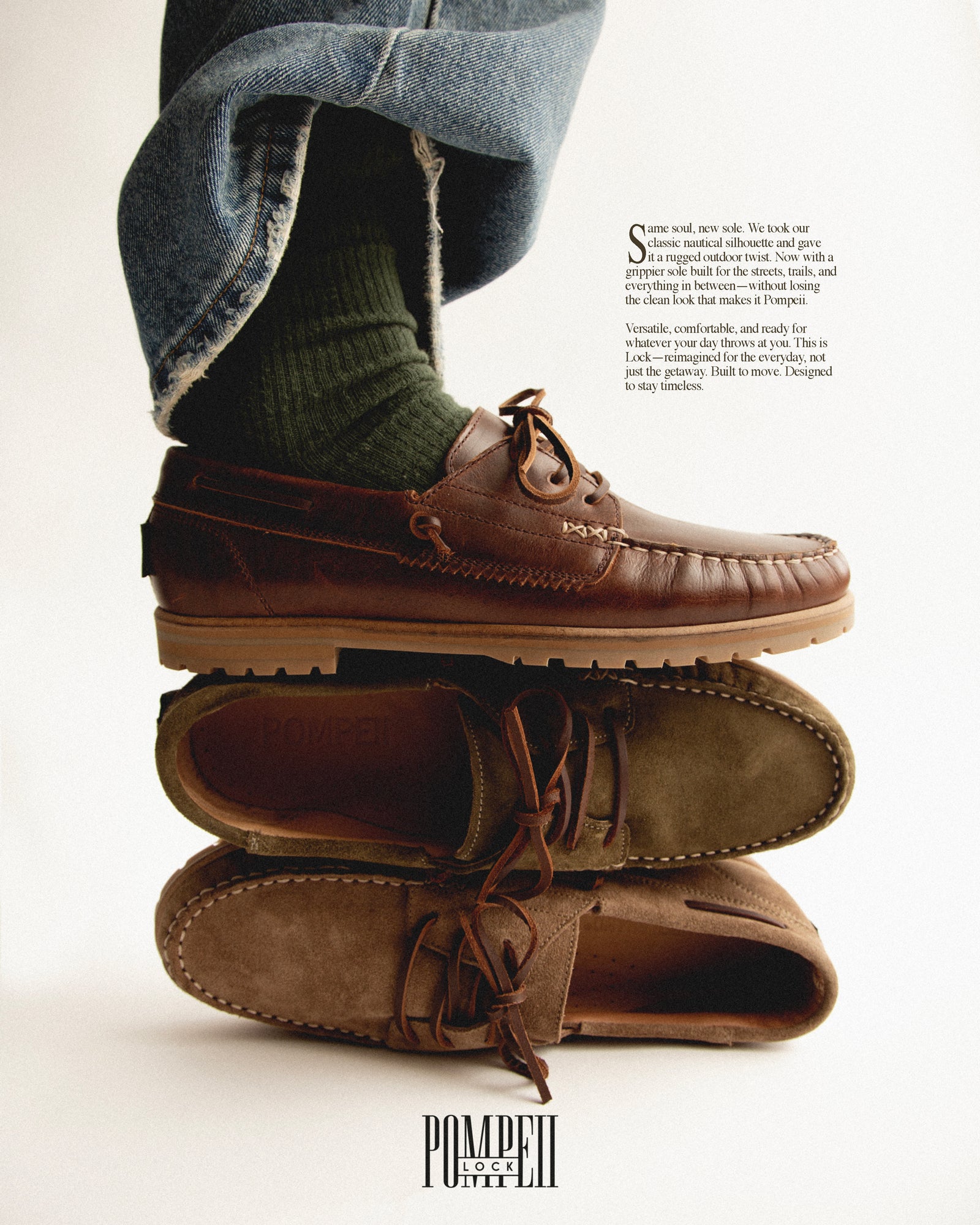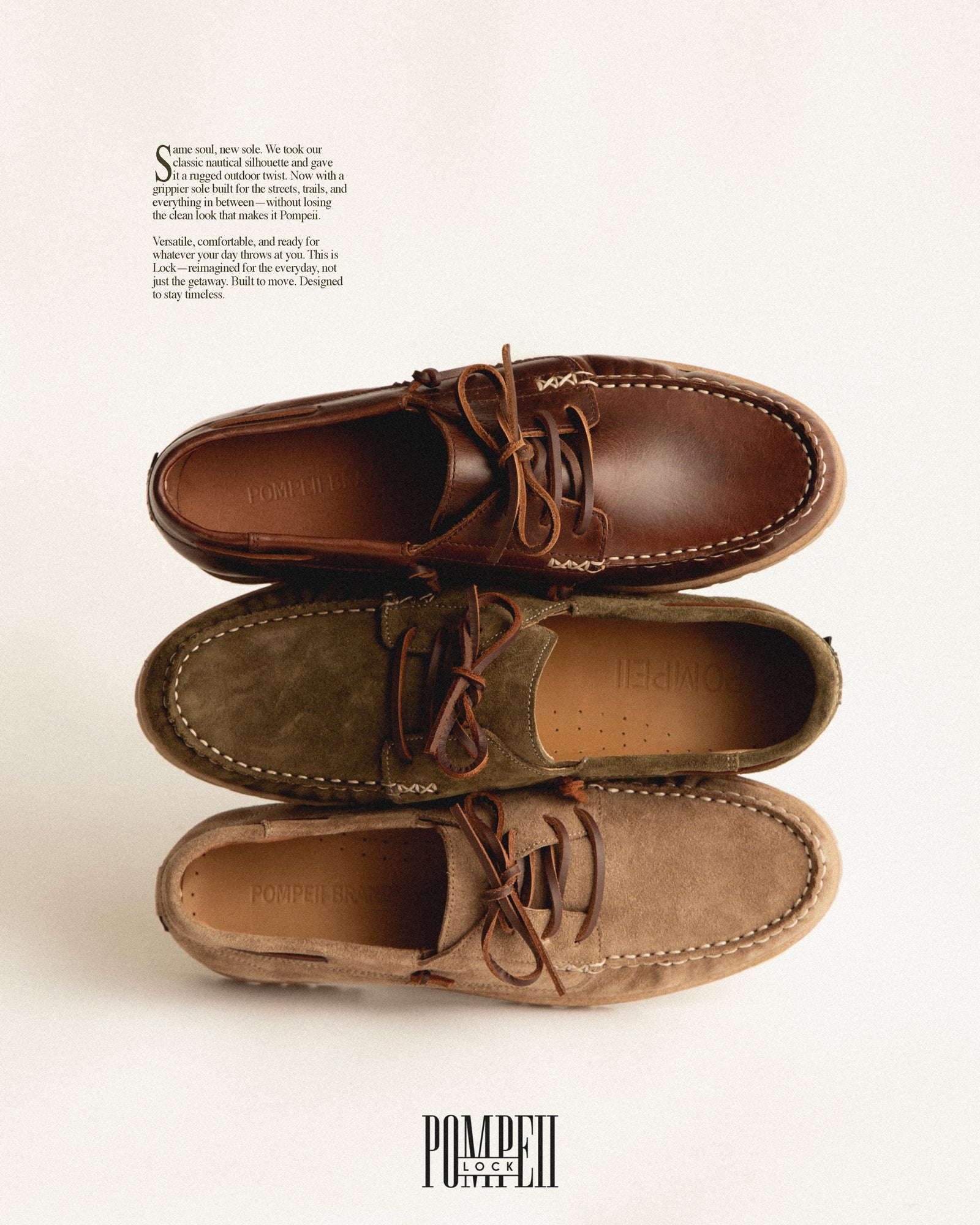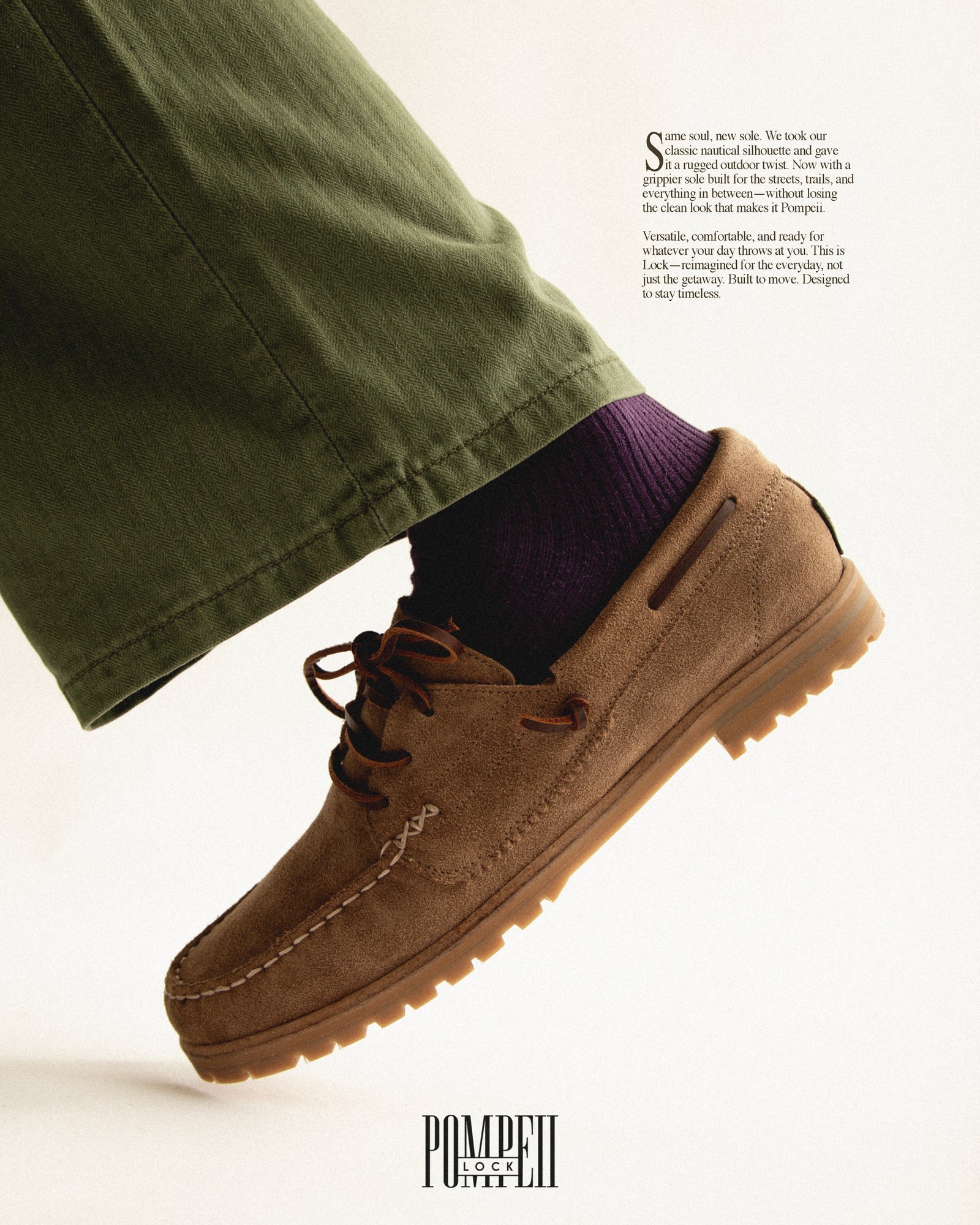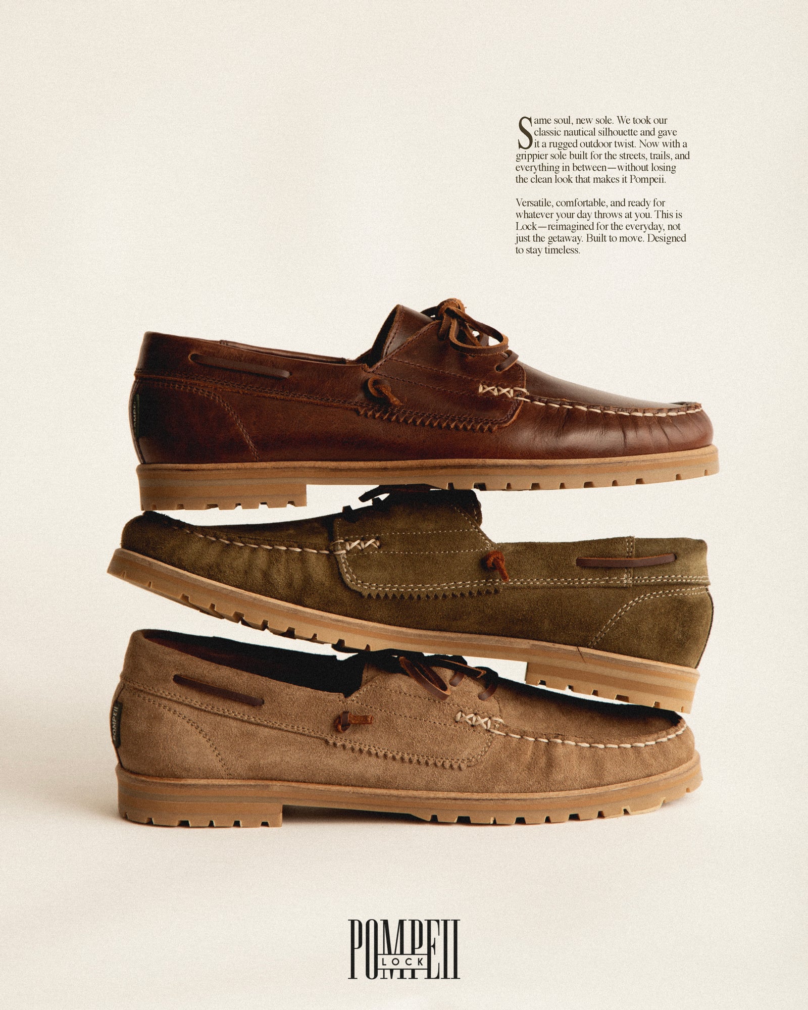 Same soul, new sole. We took our classic nautical silhouette and gave it a rugged outdoor twist. Now with a grippier sole built for the streets, trails, and everything in between—without losing the clean look that makes it Pompeii. Versatile, comfortable, and ready for whatever your day throws at you. This is Lock—reimagined for the everyday, not just the getaway. Built to move. Designed to stay timeless.