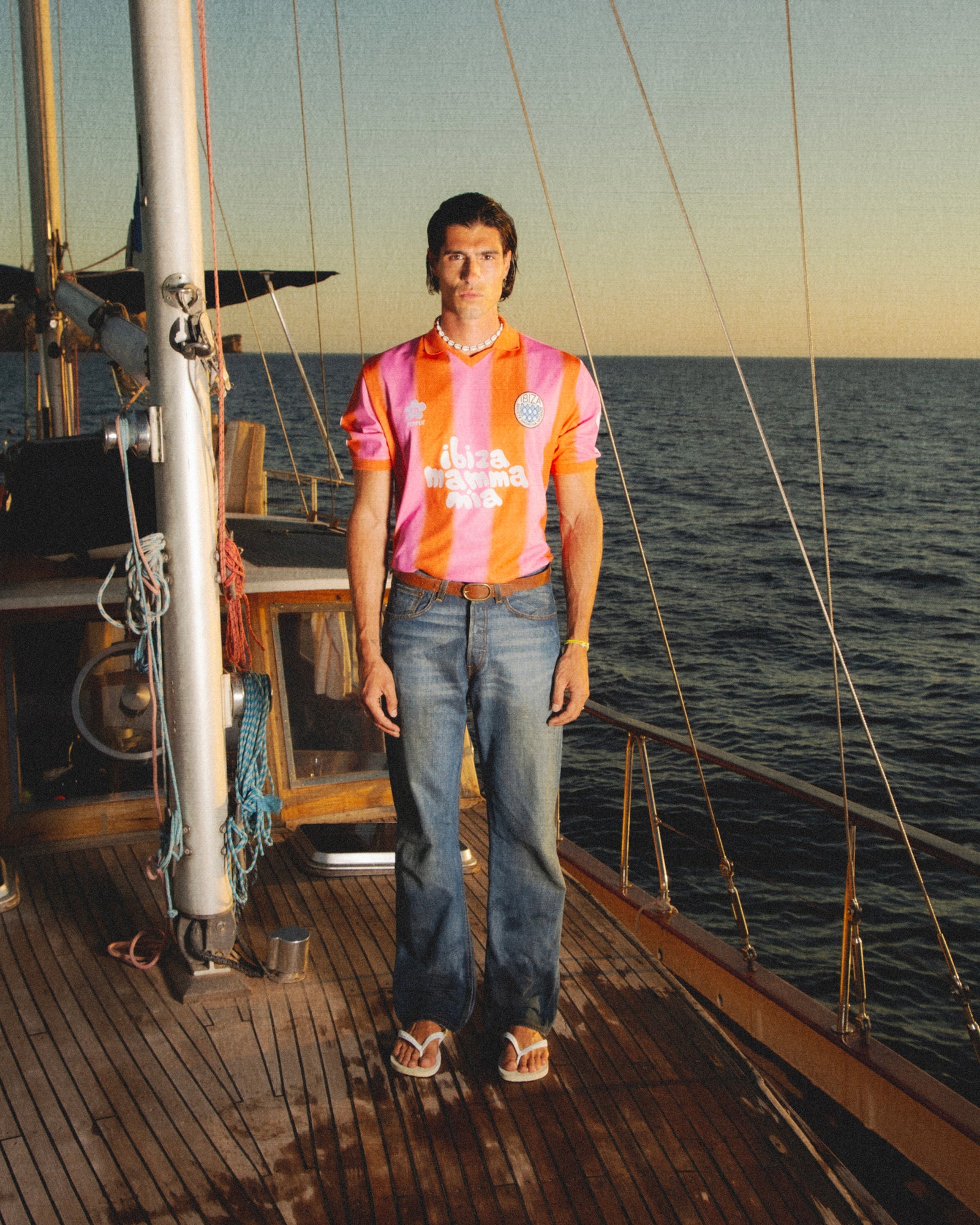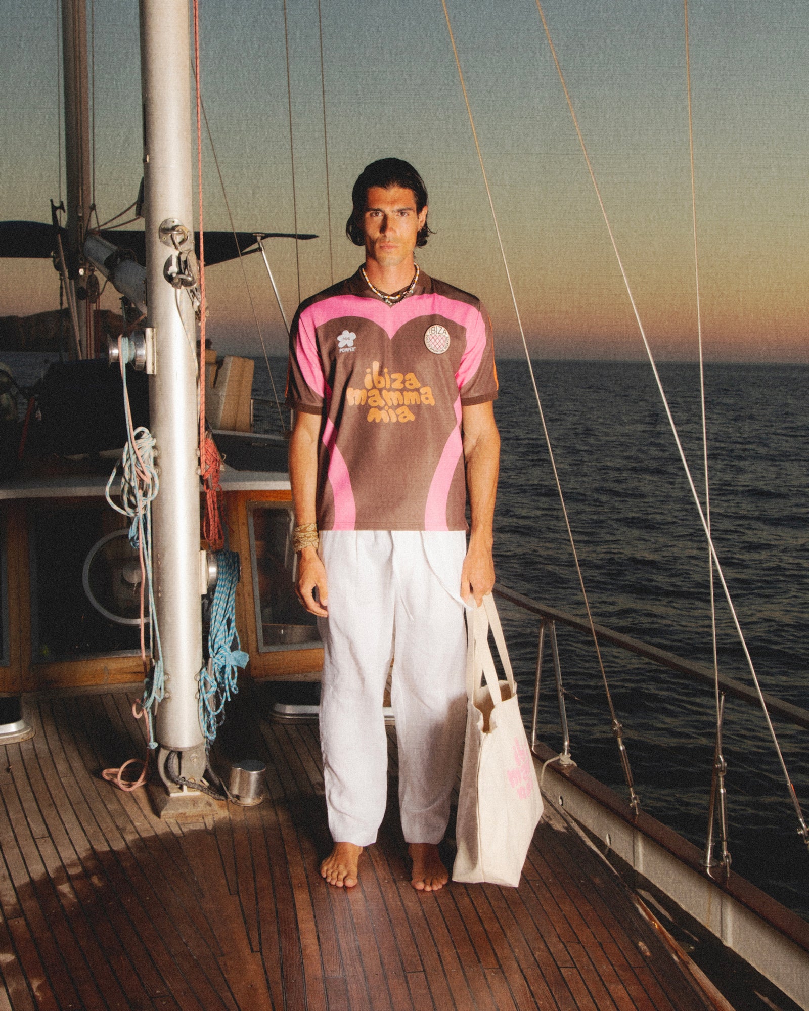 The collection is unisex and consists of two football jerseys, with collar and the symbols of the collection, such as the 'Ibiza Mamma Mia' logo on the chest, the embroidered patch 'Ibiza - Holiday Sports Club' and the screen-printed graphic on the back with the concept 'Mi casa es tu casa'. The first, features a combination of degraded orange and pink vertical stripes, inspired by the warm colours of Eivissa, while the second features the outline of a large pink heart on a brown background, a symbol of the love and freedom of expression that is breathed in Ibiza. Two tees with regular fit complete the collection, the first in the pink-white-brown color combination, the second white-orange-pink, plus an adjustable cap and two tote bags in different sizes, which incorporate the elements of the capsule and are designed to be worn on any occasion.