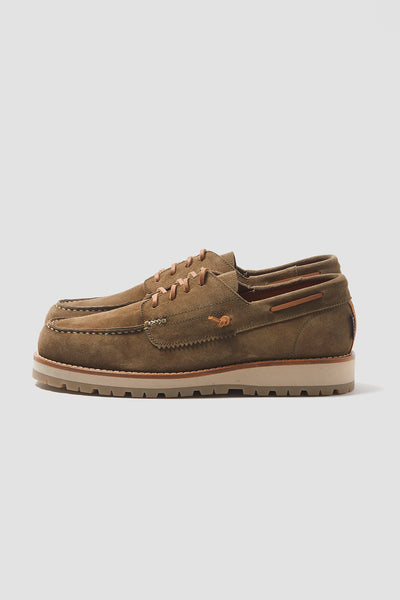 Nautico de serraje hidrófugo con cerco de piel, suela de EVA y patín antideslizante. Fabricada en España.